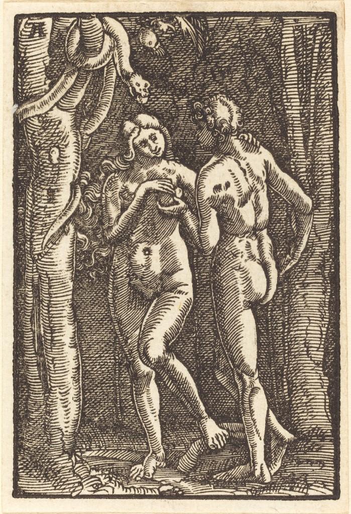 Albrecht Altdorfer. La Chute (v. 1513). Gravure sur bois, National Gallery of Art, Washington. Selon la Bible, les premiers humains, Adam et Ève, auraient désobéi aux prescriptions divines en mangeant le fruit défendu de l’arbre de la connaissance du bien et du mal. Les successeurs, c’est-à-dire l’humanité entière, se trouvent ainsi en situation de péché. Il faut donc racheter. |