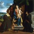 Dosso Dossi. Conversation sacrée (1510-20). Huile sur bois, 49 × 73 cm, Museo di Capodimonte, Naples. « La Vierge et l'Enfant sont placés au centre d’un cadrage horizontal. À gauche se trouvent les saints Jean-Baptiste et Barbe, tandis qu’à droite se trouvent le donateur du tableau (identifiable par l’absence d’auréole) et saint Joseph. Les personnages sont étroitement regroupés et plaqués contre le premier plan. Cette composition particulière a été introduite par Giovanni Bellini, artiste vénitien du début du XVIe siècle. En 1927, l’influent historien de l’art italien Roberto Longhi attribuait cette œuvre aux premières années du peintre de la cour de Ferrare, Dosso Dossi. Des recherches récentes suggèrent fortement que le tableau a été réalisé par Sebastiano Fillipi, un artiste obscur décédé jeune et surtout connu comme le grand-père d'Il Bastianino, un autre peintre célèbre de Ferrare. » (Commentaire Google Arts & Culture) |
