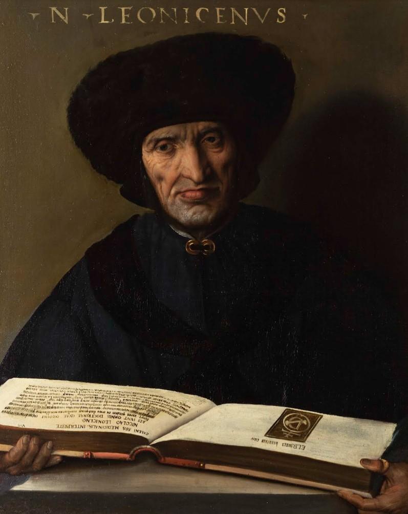 Dosso Dossi. Portrait de Niccolò Leoniceno (1521). Huile sur toile, 85 × 72 cm, Pinacoteca civica di Como, Côme. Niccolò Leoniceno (1428-1524) est un médecin et humaniste italien, spécialisé dans les textes à orientation médicale. Il fut professeur à Venise, Ferrare, Paris et Pavie. |