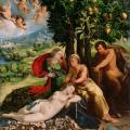 Dosso Dossi. Scène mythologique (v. 1524). Huile sur toile, 164 × 145 cm, Getty Center, Los Angeles. « Un ensemble d'indices visuels séduisants a donné lieu à de nombreuses théories à propos de cette Scène mythologique de Dosso Dossi, mais personne n'a déterminé la signification précise du tableau, si tant est que l'artiste ait eu l'intention de lui en donner une. Le personnage masculin à droite de la composition est le dieu pastoral grec Pan, ce qui a conduit certains spécialistes à appeler cette œuvre Allégorie de Pan. Pan était un satyre qui, dans les allégories de la Renaissance, personnifiait la luxure. Il devait sa réputation amoureuse à la séduction qu'il exerçait sur les nymphes en jouant de la musique sur sa syrinx, qu'il tient ici dans sa main gauche. Le nu endormi au premier plan pourrait être la nymphe Echo, qui a rejeté Pan pour Narcisse. La vieille femme au centre du groupe est peut-être la protectrice d'Écho, Gea (la Terre), qui est assise au-dessus d'elle et la protège. La femme à côté d'elle, portant une armure par-dessus une robe verte et enveloppée d'une cape rouge flottante, n'a pas encore été identifiée. Un groupe d'érotes (dieux ailés de l'amour) plane à côté des agrumes. |