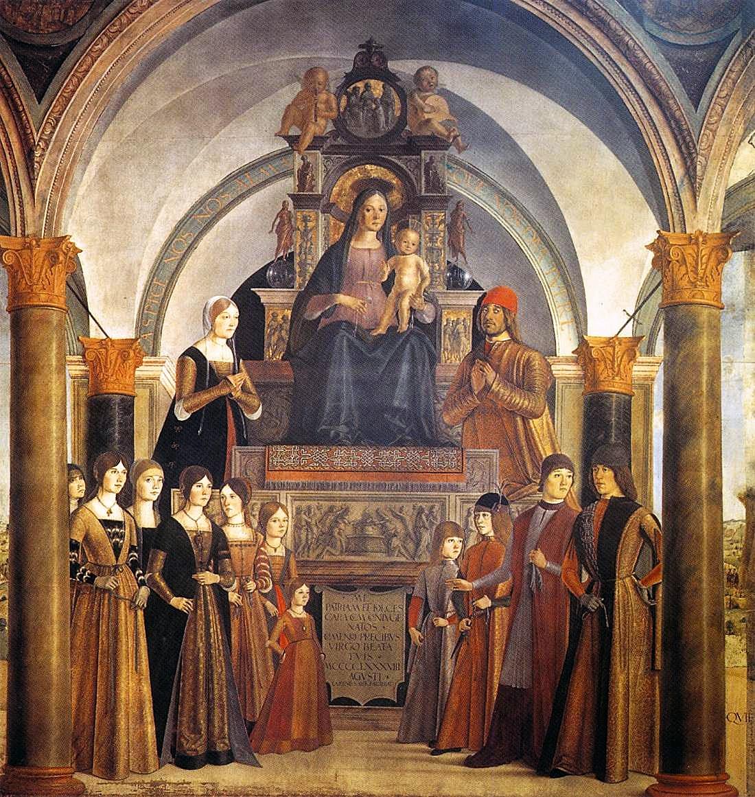 Lorenzo Costa. Retable Bentivoglio (1488). Huile sur toile, église San Giacomo Maggiore, Bologne. Giovanni II Bentivoglio (1443-1508) est un chef militaire (condottiere) issu d’une famille patricienne de Bologne, qui gouverna la ville pendant une quarantaine d’années, de 1462 à 1506. Il commande ce retable à Lorenzo Costa pour la chapelle de la famille Bentivoglio dans l’église San Giacomo Maggiore. Sa nombreuse famille devait figurer sur la composition. |