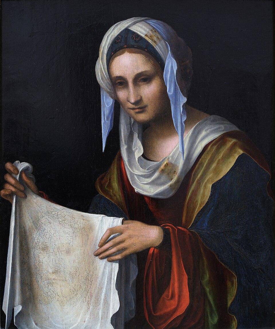 Lorenzo Costa. Sainte Véronique (v. 1508). Huile sur bois, 65 × 54 cm, musée du Louvre, Paris. Le thème provient d’une légende chrétienne post biblique. Lorsque Jésus-Christ portait sa croix vers le Golgotha, une femme de Jérusalem, Véronique, lui donna son voile afin qu'il puisse s'essuyer le front. Lorsque Jésus rendit le voile, son image s'y était miraculeusement imprimée. |
