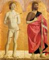 Polyptyque de la Miséricorde (1445-50). Tempera sur bois, 330 × 273 cm, Pinacoteca Comunale, Sansepolcro. Ce polyptyque a été commandé par la Confraternité de la Miséricorde de Sansepolcro, la ville natale du peintre. Tout en haut une crucifixion et en-dessous une Vierge de la Miséricorde entourée de personnages plus petits afin de marquer la hiérarchie. A droite de la Vierge, saint Sébastien et saint Jean-Baptiste. A sa gauche, saint André et saint Bernard. Les saints de petite dimension des parties latérales et la prédelle ont été réalisés plus tard par des collaborateurs de Piero della Francesca.