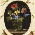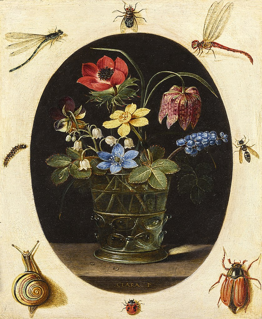 Clara Peeters. Nature morte aux fleurs entourée d'insectes et d'un escargot (1615-18). Huile sur cuivre, 16,6 × 13,5 cm, National Gallery of Art, Washington. L’une des rares natures mortes florales de Clara Peeters, au caractère décoratif marqué.
