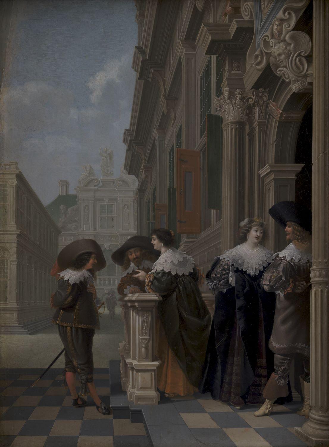 Dirk van Delen. Conversation dans la cour d'un palais (1644). Huile sur bois, 54 × 47 cm, National Galleries of Scotland. « Van Delen a vécu près de la ville d'Arnemuiden, à proximité de Middelburg, dans la province de Zélande, où il a été membre de la guilde des peintres de 1639 à 1665. Ses peintures étaient entièrement consacrées à des sujets architecturaux. Les premières œuvres de Van Delen comprennent des intérieurs d'églises et des vues de palais imaginaires, dont beaucoup sont inspirées d'estampes italiennes et flamandes. Les peintures d'églises deviennent moins fréquentes dans l'œuvre de Van Delen après 1630, lorsqu'il commence à se concentrer sur des vues de palais. Au fil du temps, la palette de Van Delen s'éclaircit et les façades de ses palais sont décorées de marbre rose et blanc et agrémentées d'un ensemble de sculptures baroques. Les riches personnages qui peuplent ses scènes sont souvent issus d'estampes de célèbres graveurs italiens. » (Commentaire National Galleries of Scotland) |