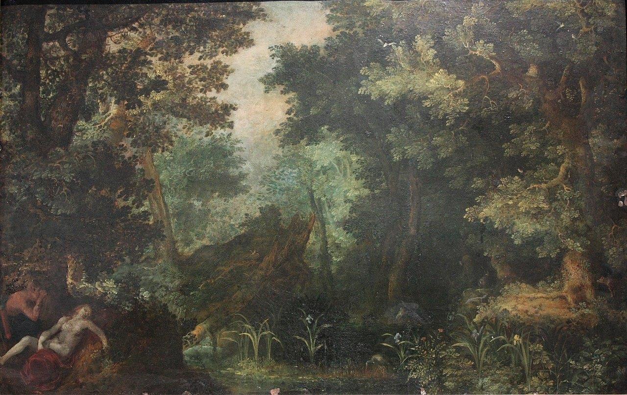 Gillis van Coninxloo. Paysage forestier avec figures (1602). Huile sur toile, 84 × 152 cm, collection particulière. Cette composition, fréquente chez van Coninxloo, comporte un massif forestier profond à gauche et une ouverture vers l’horizon en haut et à droite, avec des figures animant l’ensemble (même utilisation de l’espace dans Paysage avec le jugement de Pâris ou encore Paysage avec Vénus et Adonis). |
