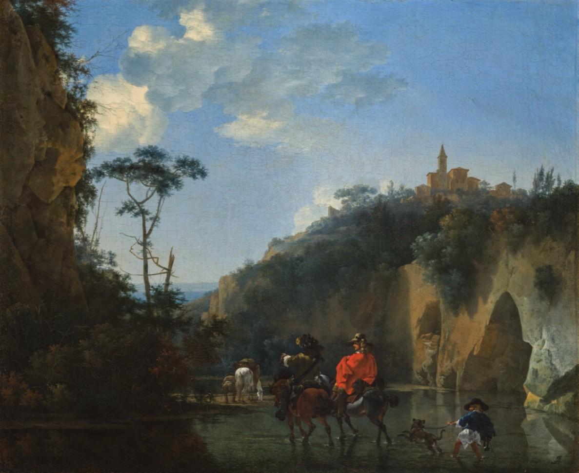Jan Asselijn. Gué entre de hautes falaises (1636-52). Huile sur toile, 56 × 68 cm, National Gallery, Prague. « Asselijn a travaillé à Rome entre 1636 et 1644 avec d'autres peintres hollandais qui se sont associés au sein d'un groupe bohème appelé Bentvueghels (Bande d’oiseaux). Chaque membre recevait un surnom, celui d’Asselijn étant petit crabe (Krabbetje), car sa main gauche était déformée. Le peintre est fasciné par la nature des paysages italiens, avec leur lumière dorée et leur ciel d'un bleu profond. Ayant accumulé un certain nombre de dessins, il les utilisa, même après son retour à Amsterdam. » (Commentaire National Gallery, Prague) |