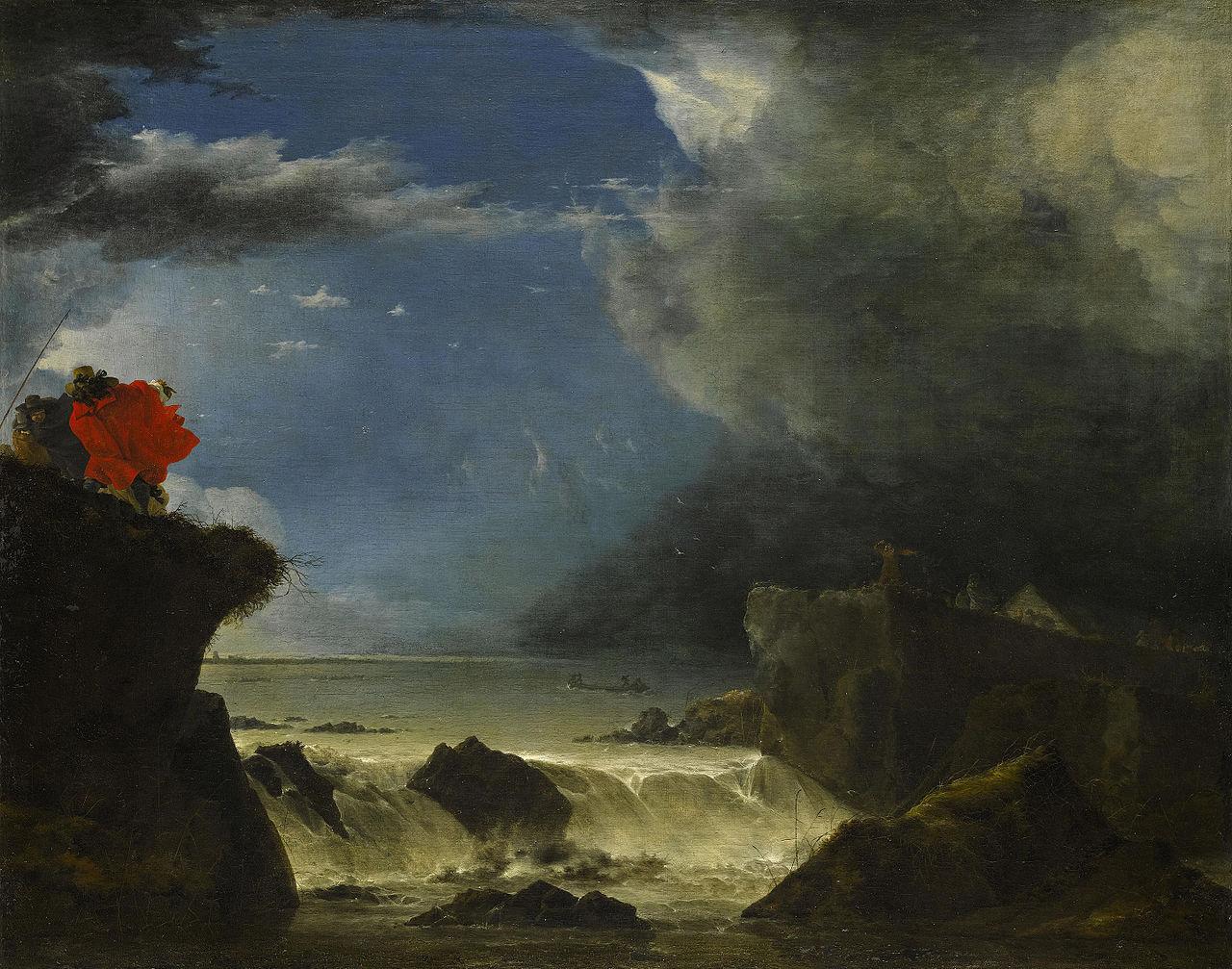 Jan Asselijn. La brèche du Sint Anthonisdijk (1651). Huile sur toile, 86 × 108 cm, Rijksmuseum, Amsterdam. La Sint Antoniesdijk était une digue qui longeait la rive sud de la rivière appelée Binnen-IJ. Cette digue protégeait les habitations d’Amsterdam. Dans la nuit du 5 au 6 mars 1651, de forts vents du nord-ouest et une marée haute provoquèrent la rupture de la Sint Anthonisdijk en deux endroits, inondant une grande partie de la ville d’Amsterdam. |