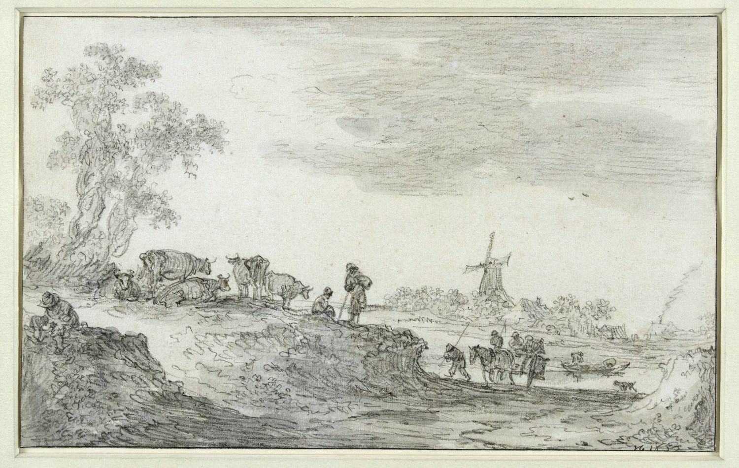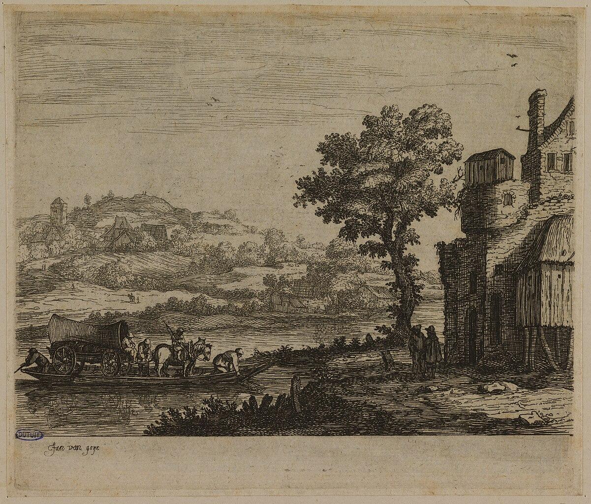 Jan van Goyen. Le bac (v. 1650). Estampe sur papier, 15 × 17,5 cm, Petit Palais, musée des Beaux-arts de la Ville de Paris. Un chariot attelé à deux chevaux a été chargé sur un bac pour la traversée de la rivière. La composition comporte deux parties : un premier plan au dessin précis comportant la maison la rive et le bac ; un arrière-plan stylisé évoquant un paysage de colline. |