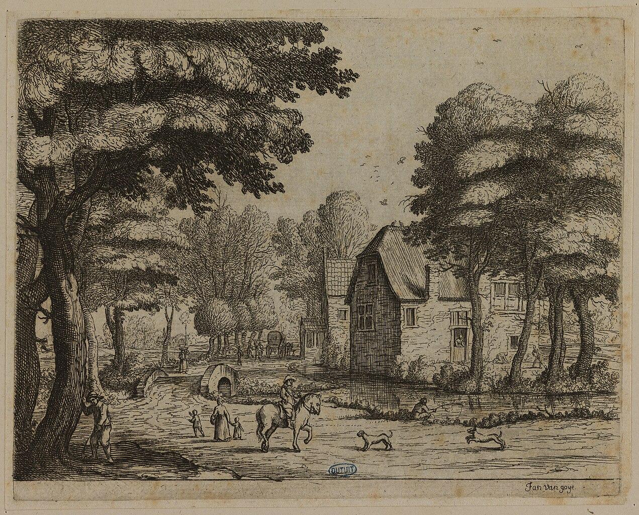 Jan van Goyen. Le pont de pierre (v. 1650). Estampe sur papier, 13,8 × 17,5 cm, Petit Palais, musée des Beaux-arts de la Ville de Paris. Cette estampe signée, provenant d’une gravure sur cuivre, est une composition ne représentant pas un lieu réel. L’artiste magnifie la nature et sa relation avec l’homme. Robustesse et sérénité émanent de l’ensemble avec de très beaux spécimens d’arbres, de solides maisons parfaitement intégrées à l’espace naturel et des figures humaines de petite dimension qui vaquent paisiblement à leurs occupations. |