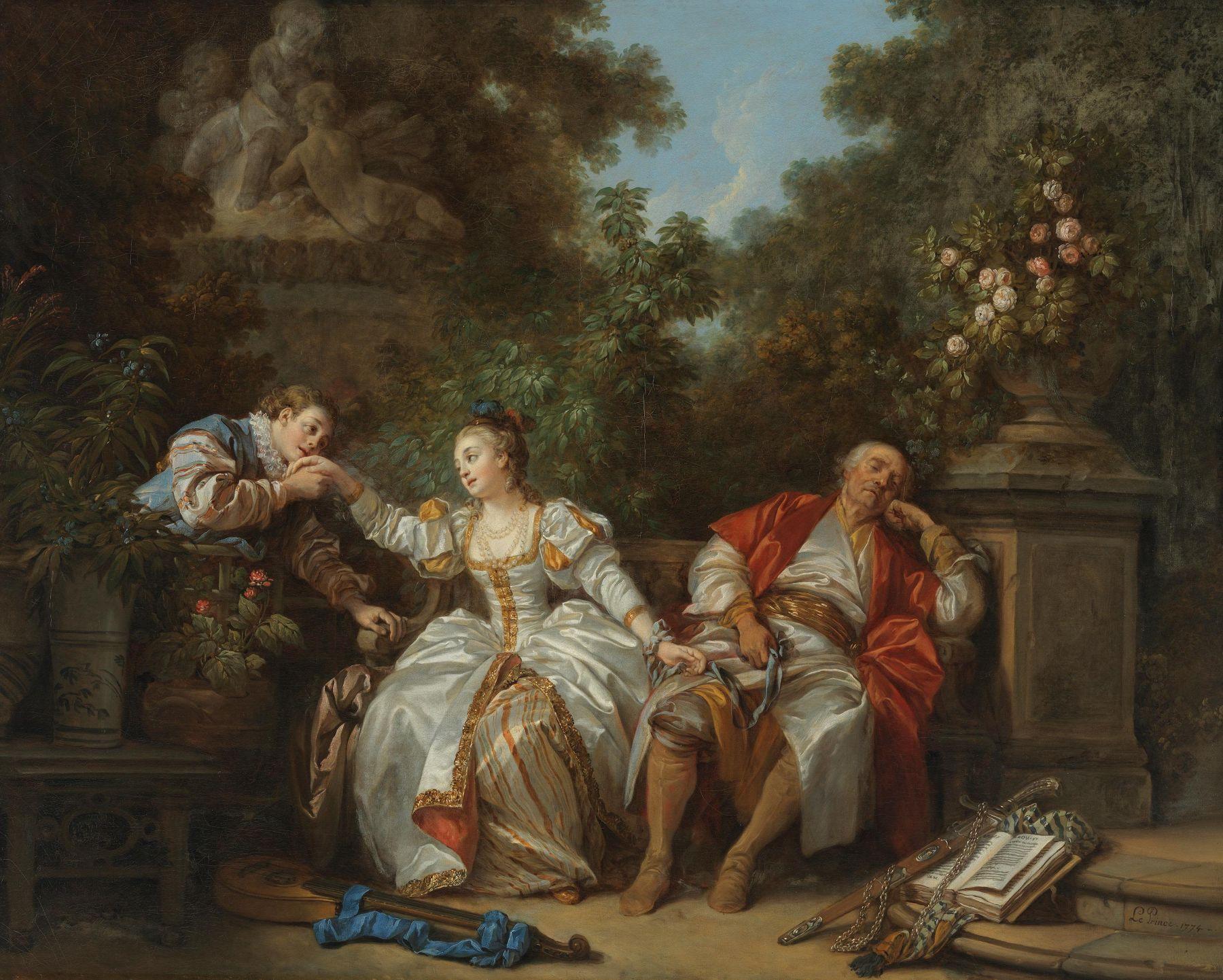 Jean-Baptiste Le Prince. L'Amour à l'espagnole (1773). Huile sur toile, 73 × 60 cm, musée des Beaux-Arts, Angers. « Dans un intérieur bourgeois, une jeune femme semble assoupie. Penché à la fenêtre, un jeune homme lui joue de la guitare. Le sujet du tableau est l'Amour à l'espagnol, jeu de séduction. Ces deux personnages sont vêtus de costumes luxueux, mais n'ayant cependant rien d'espagnol. Ce terme désigne en fait, au 18e siècle, une mode de fantaisie s'inspirant des tableaux flamands et des costumes de théâtre contemporain. |