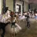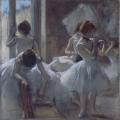 Edgar Degas. La classe de danse (1871-74). Huile sur toile, 85 × 75 cm, musée d’Orsay, Paris. « A partir du début des années 1870 et jusqu'à sa mort, les ballerines à l'exercice, aux répétitions ou au repos deviennent le sujet de prédilection de Degas, inlassablement repris avec de nombreuses variantes dans les postures et les gestes […] Degas a observé avec attention les gestes les plus spontanés, naturels et anodins, moments de pause où la concentration se relâche et le corps se détend, après l'effort d'un apprentissage exténuant et d'une implacable rigueur. Le point de vue en légère plongée, axé sur la diagonale de la pièce, accentue la perspective fuyante des lattes du parquet. » (Commentaire musée d’Orsay) |