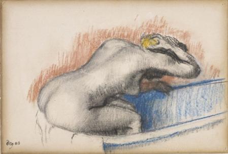 Edgar Degas. Le tub (1886). Pastel sur carton, 60 × 83 cm, musée d’Orsay, Paris. « Présenté à la huitième exposition impressionniste en 1886, ce pastel appartient à une série de sept que Degas exécuta au milieu des années 80, sur le thème de la femme à sa toilette, thème déjà envisagé par l'artiste dans une série de monotypes une dizaine d'années auparavant. L'observation sans concession du geste intime et quotidien ne doit rien à la tradition pittoresque du sujet galant des femmes à leur toilette. La pose de la jeune femme, parfois interprétée par la critique contemporaine comme l'expression d'une certaine animalité, dérive de celle de l'Aphrodite accroupie antique. La nature morte aux objets de toilette, dont la perspective est faussée suivant un principe japonisant, le surplomb, font de ce pastel une des compositions les plus audacieuses et les plus virtuoses des œuvres de Degas sur le sujet moderne de la femme au tub. » (Commentaire musée d’Orsay) |