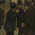 Edgar Degas. Portraits à la Bourse (1878-79). Huile sur toile, 100 × 82 cm, musée d’Orsay, Paris. « … ce que l'on pourrait d'abord prendre pour une simple scène de la vie parisienne est avant tout un portrait : celui du banquier Ernest May (1845-1925), collectionneur et amateur de Degas […] Fils d'un banquier qui a fait faillite, Degas connaît le milieu de l'argent mais refuse d'y pénétrer. May domine la scène. Autour de lui, d'autres personnages suggèrent l'agitation qui règne à la Bourse. L'artiste ne montre toutefois pas leurs visages, ou il laisse leurs traits flous, afin de diriger l'attention sur le modèle. May le visage blême et allongé, paraît étonnamment plus âgé que ses trente-quatre ans. » (Commentaire musée d’Orsay) |