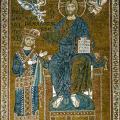 Couronnement de Guillaume II (v. 1180). Mosaïque, cathédrale de Monreale, Sicile. Guillaume II, roi de Sicile et fondateur de la cathédrale, est représenté comme le donateur du monument à l'Église. Le Christ lui-même pose la couronne royale sur sa tête, ce qui correspond à la légitimité politique de l'époque : les rois tenaient leur pouvoir de Dieu.