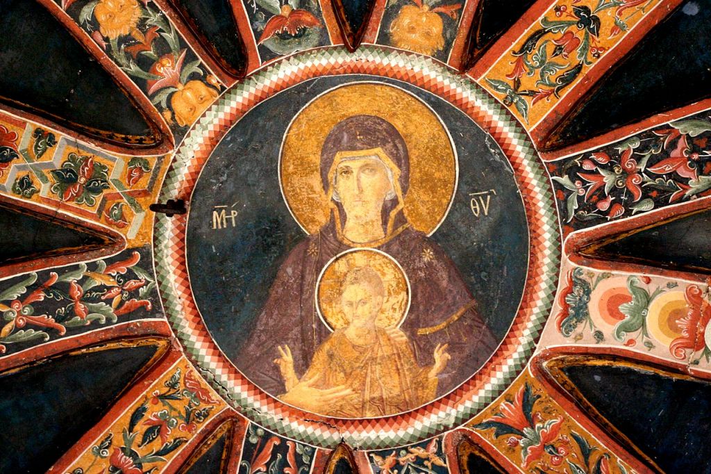 Dôme du paracclésion, détail (14e s.). La Vierge et l'Enfant Jésus au centre du dôme.