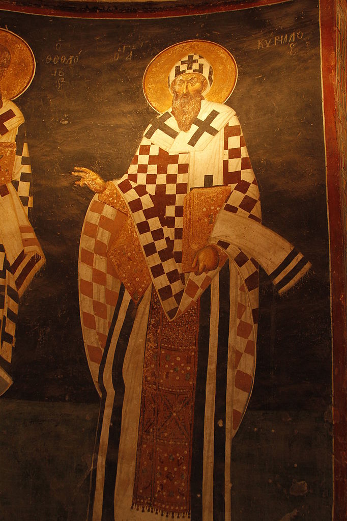 Fresque des patriarches, détail (14e s.). Le dernier personnage sur la gauche est Cyrille d'Alexandrie (376-444) qui fut patriarche d'Alexandrie (c'est-à-dire évêque) et qui s'acharna à lutter contre ce qu'il qualifiait de paganisme : judaïsme et diverses « hérésies ».