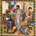 Codex Purpureus Rossanensis (6e s.). Enluminures sur parchemin, 31 × 26 cm, musée diocésain d'art sacré, Rossano, Italie. Ce manuscrit, aussi appelé Évangéliaire de Rossano, comporte 188 folios consacrés aux Évangiles selon Matthieu et Marc.