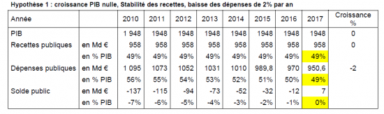 Avec une croissance économique de 1% par an et une stabilité des recettes, il faut diminuer les dépenses de 2% par an pour atteindre l’équilibre en 2017. Dans ce cas, le taux des prélèvements par rapport au PIB baisse sensiblement. La difficulté est alors l’acceptabilité politique et sociale des baisses de dépenses publiques.