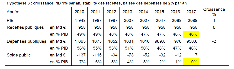 On cherche ici à partir de quel taux de croissance du PIB, on peut obtenir l’équilibre en 2017 tout en maintenant le niveau des recettes à 49% du PIB comme en 2010. On suppose que les dépenses dérivent de 1% par an. Il faut alors une croissance économique annuelle de 3% qui permet aisément une augmentation de 3% par an des recettes.