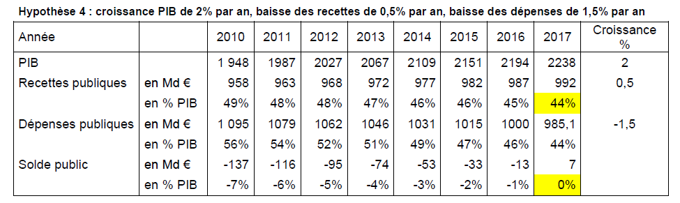 En l’absence de croissance économique et d’augmentation des recettes, il faudrait diminuer les dépenses de 2% par an pour atteindre l’équilibre en 2017. Les dépenses passeraient de 56 à 49% du PIB.